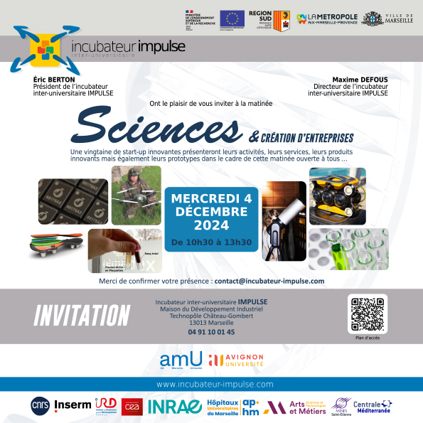 C’est avec un grand plaisir que l’incubateur inter-universitaire Impulse souhaite vous inviter à ses Portes Ouvertes intitulé « Sciences et Création d’entreprises » le mercredi 4 décembre 2024, de 10h30 à 13h30.